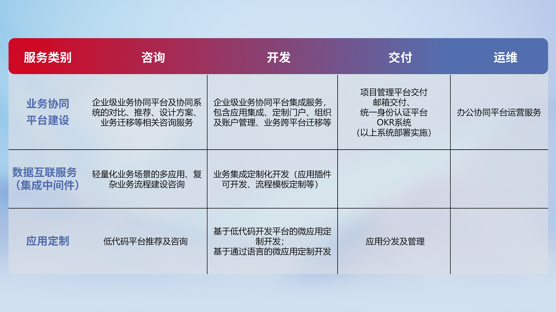 针对钉钉、、、企微、、、、IDaas等平台级产品提供产品的规划、、、、方案、、、交付、、、、定制化开发等服务,,,实现如统一协同办公、、、智能客户服务、、、、混合会议管理、、、、智能数据查询、、、、等业务场景,,实现数字化转型。。。